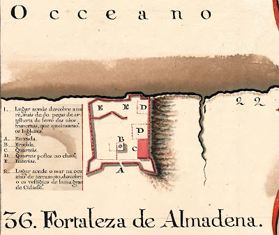 As linhas que vão de encarnado são as obras de pedra e cal, as que vão de preto são as obras de terra e as que vão de pontinhos são as obras arruinadas.